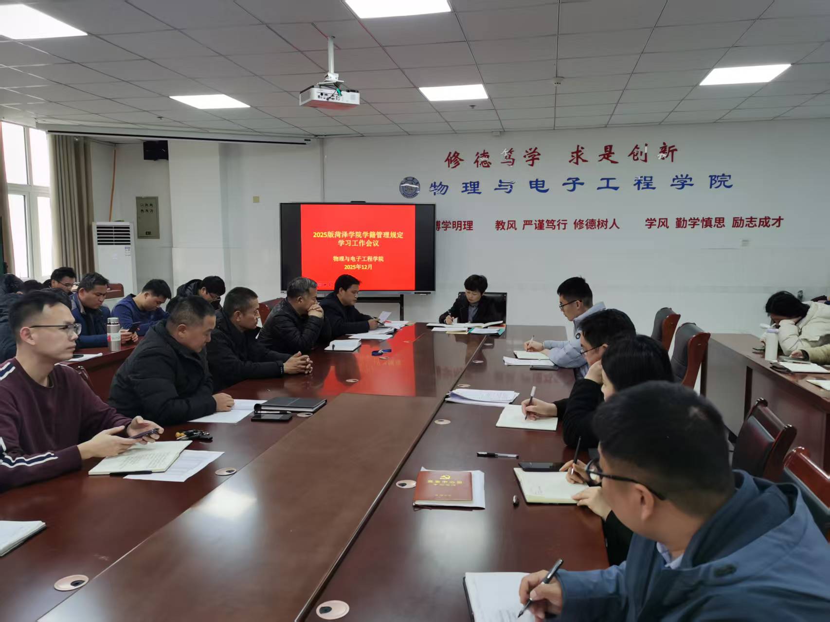 为深入理解并准确执行学校教育教学管理新规,保障学生权益,规范管理流程,12月11日,物理与电子工程学院组织召开专题工作会议,集中学习《菏泽学院普通全日制学生学籍管理规定(修订)》。学院领导班子成员、各系主任、全体辅导员及教学管理人员参加会议。