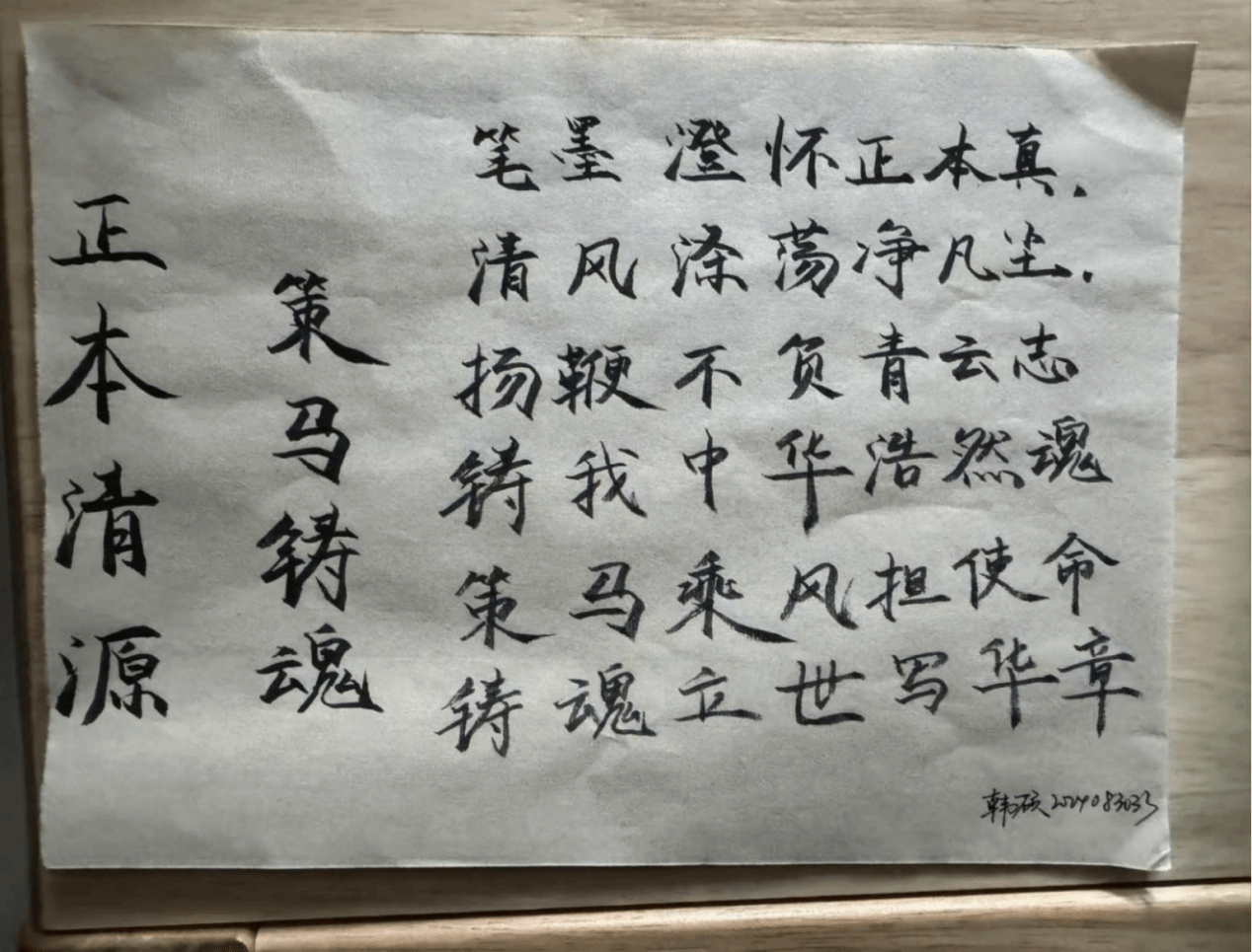 为大力弘扬优良学风、传承中华优秀传统文化,引导学生端正学习态度、树立正确学习观念,3月31日,物理与电子工程学院在综合实验楼W506教室开展“正本清源,策马铸魂”学风建设书法征集活动。