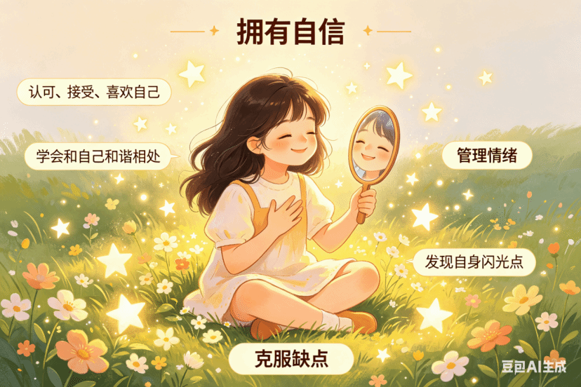 第一,学会和自己和谐相处,管理自己的情绪,与自己的情绪相处。发现自己的闪光点,看到自己身上的优点。面对自身的缺点,不气馁,有意识地克服缺点,避免陷入过度自卑的泥潭中,更重要的是多看到自己的好的一面,发挥自己的长处,不断挖掘自己的潜能,完善自己。最终达到认可自己,接受自己,喜欢自己,拥有自信,相信自己。