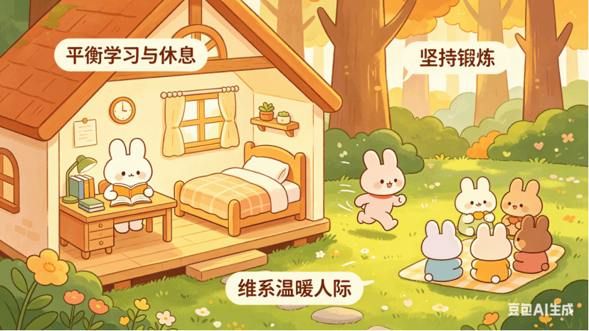 第二,对自己的生活负责,不断提升综合素养,提高处理问题的能力,学会平衡生活中的各个方面。例如,要平衡好生活与学习、自我与他人、休息与锻炼及放松之间的关系,提升生活适应能力。具体来说,我们应保持充足的睡眠,睡眠是恢复体力、保持活力的重要方式,对维护身心健康非常关键。要坚持锻炼,把运动变成一种生活方式。运动不仅有助于身体健康,还能促使身体释放内啡肽,使我们保持平静,缓解消极情绪。同时,要维护良好的人际关系,积极参与集体活动,在人际互动中提升处理人际关系的能力。