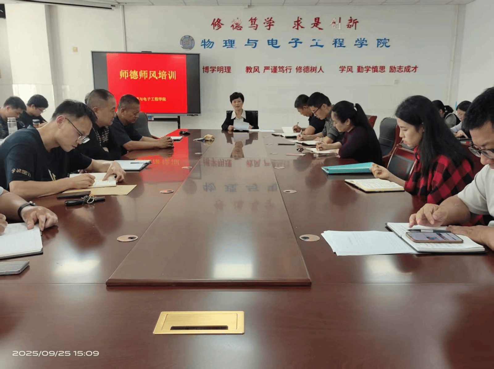 为持续深化作风建设、筑牢师德师风防线,大力弘扬教育家精神,进一步提升教师队伍素养,9月25日,物理与电子工程学院在综合实验楼W207会议室开展师德师风培训会议。物理与电子工程学院党委班子成员及全体教职工参加此次会议。学院党委书记徐鹤主持会议。