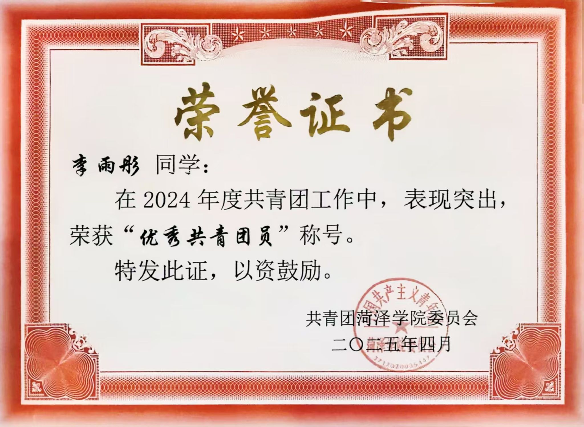 2025年04月,获校“优秀共青团员”荣誉称号;