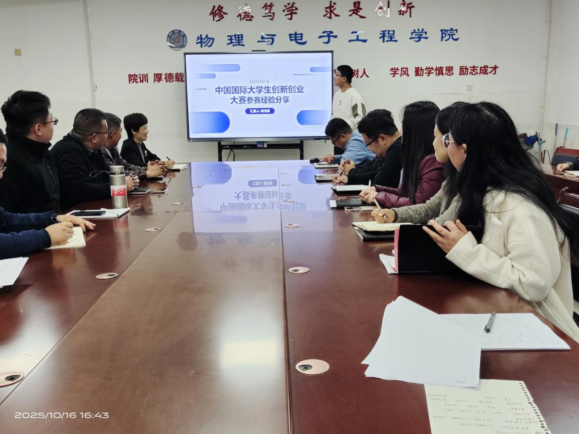 为深入贯彻国家创新驱动发展战略,着力提升新时代大学生的创新精神与实践能力,10月16日,物理与电子工程学院在综合实验楼W楼207会议室成功举办创新创业大赛参赛经验分享会。学院党委书记徐鹤、党委副书记祝清森、各系主任、辅导员及专业教师代表共同出席,会议由杨茂森老师进行主题分享。