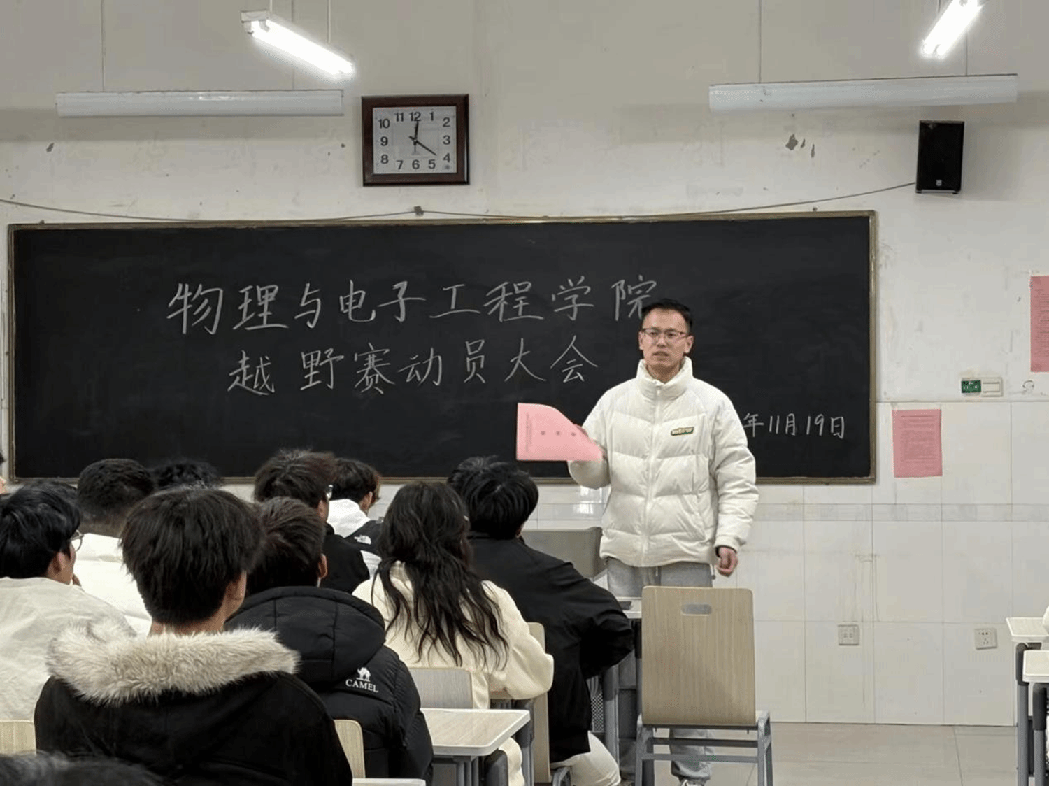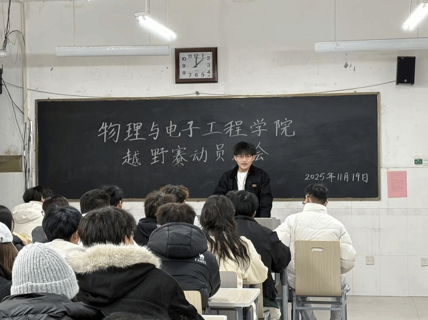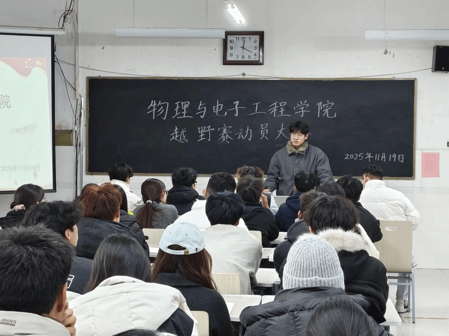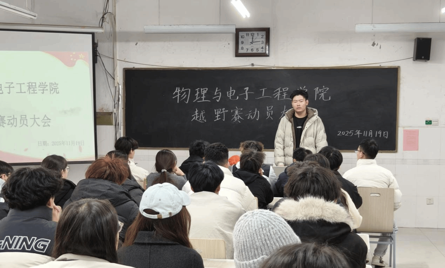 为统筹越野赛工作安排,确保各部门有序分工,11月19日,物理与电子工程学院在综合实验楼W502教室召开第四次全体例会暨越野赛动员大会。本次会议由2025届学生自律联合会秘书长王彦琳主持,李晨老师出席会议,全体学生会成员参会。