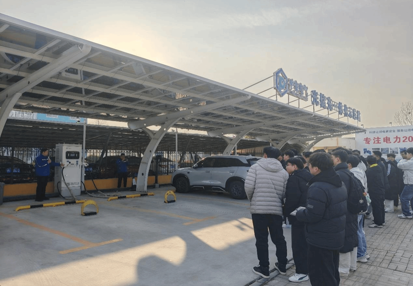 见习过程中,企业工程师们对电气设备及工艺流程详细、耐心地讲解让学子们眼前一亮。学子们也带着课堂所学主动探究,在充电桩智能箱变、一体式直流充电桩等新能源设备前驻足研讨,在高低压设备装配检测区记录操作流程和接线图纸,现场学习氛围热烈且浓厚。