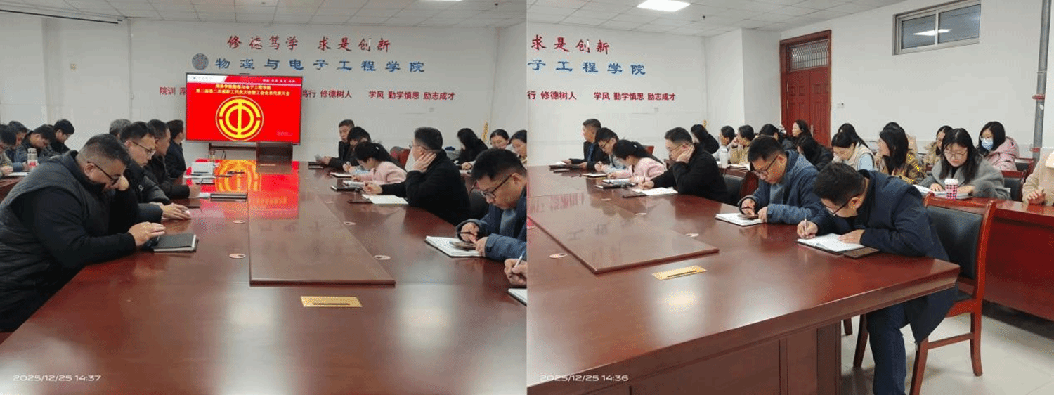 12月25日下午,物理与电子工程学院第二届第二次教职工代表大会暨工会会员代表大会在综合实验楼W207会议室召开。学院党委班子成员及教职工代表齐聚一堂,为学校高质量发展建言献策,以高度的责任感和使命感共商学校发展大计,擘画高质量发展新蓝图。