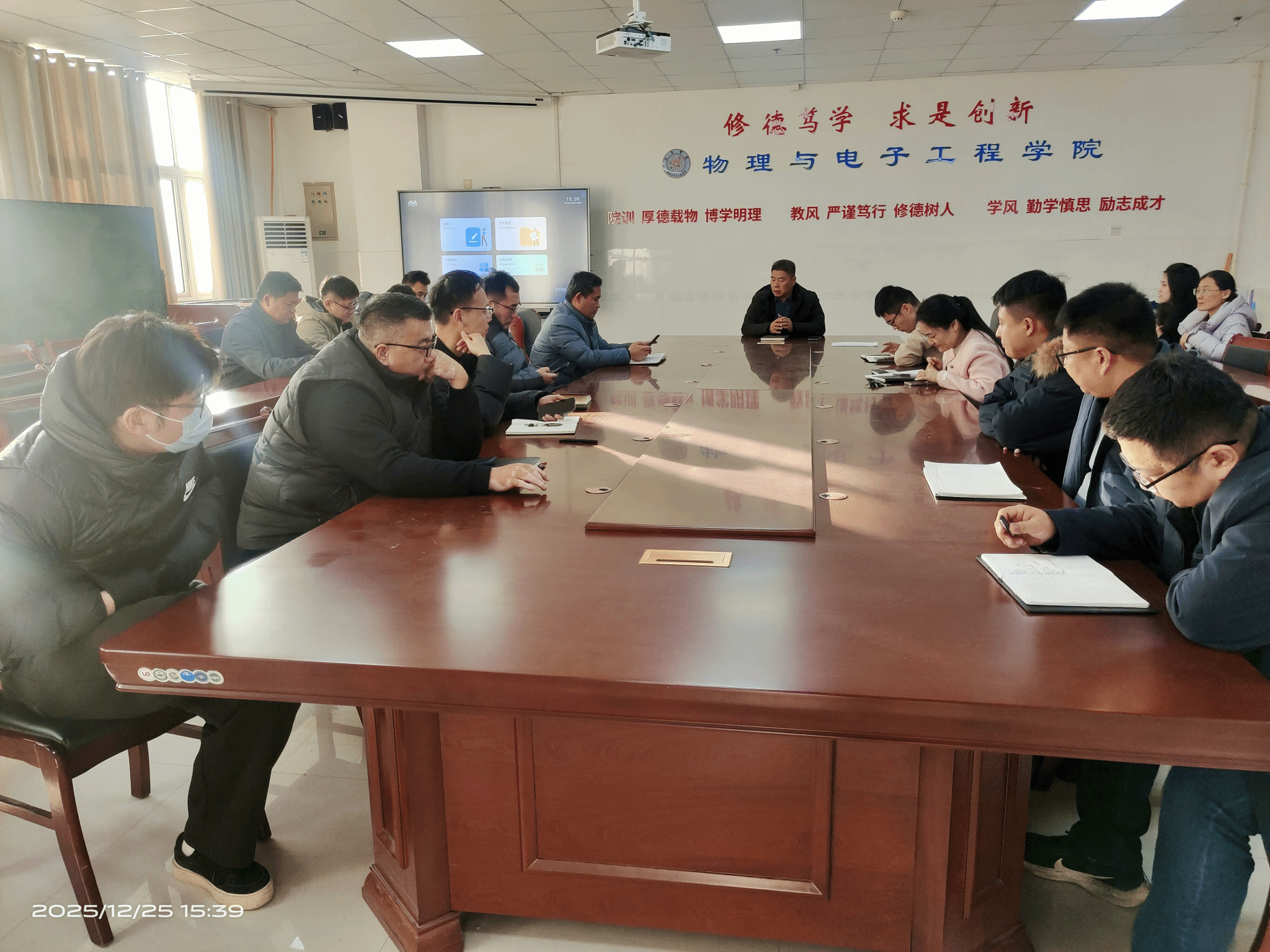 为进一步抓实期末学生管理工作、筑牢校园安全防线,确保学期末各项工作平稳有序推进,12月25日,物理与电子工程学院在综合实验楼W楼W207会议室召开辅导员、班主任会议。物理与电子工程学院党委副书记祝清森、全体辅导员和班主任出席此次会议。