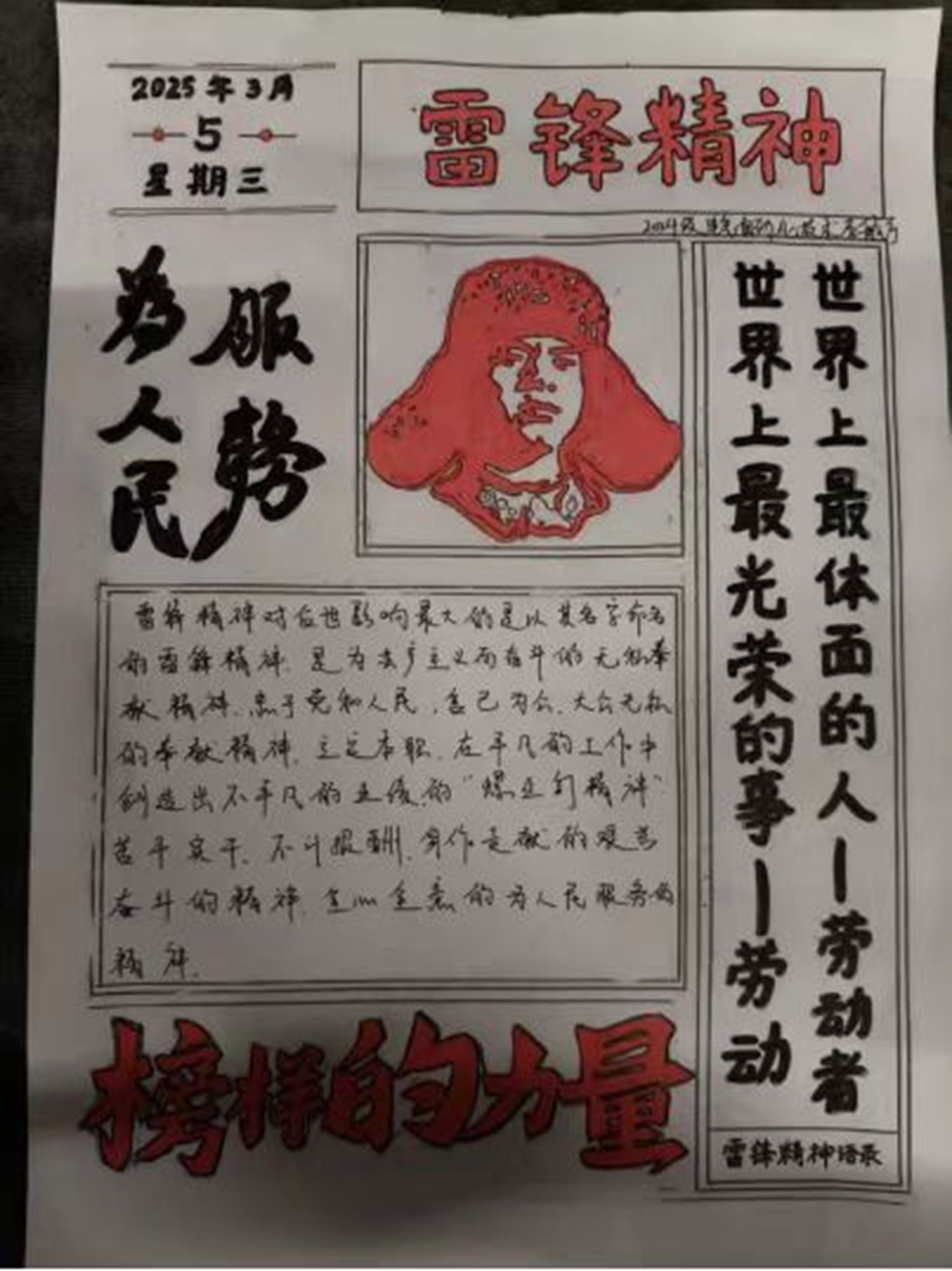 学院开展雷锋主题手抄报征集活动,以文化创意形式传承雷锋精神。同学们以笔墨为桥梁,将新时代雷锋事迹、志愿服务场景与青春感悟融入作品,既展现了扎实的绘画与书写功底,又传递出传承雷锋精神的坚定决心,深化了对雷锋精神的认知,让志愿精神扎根心底。