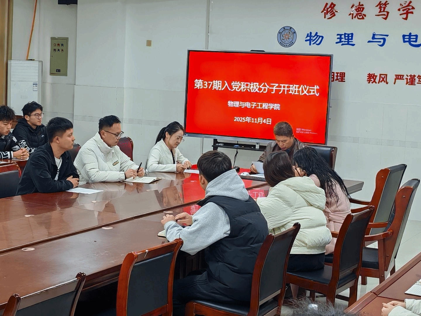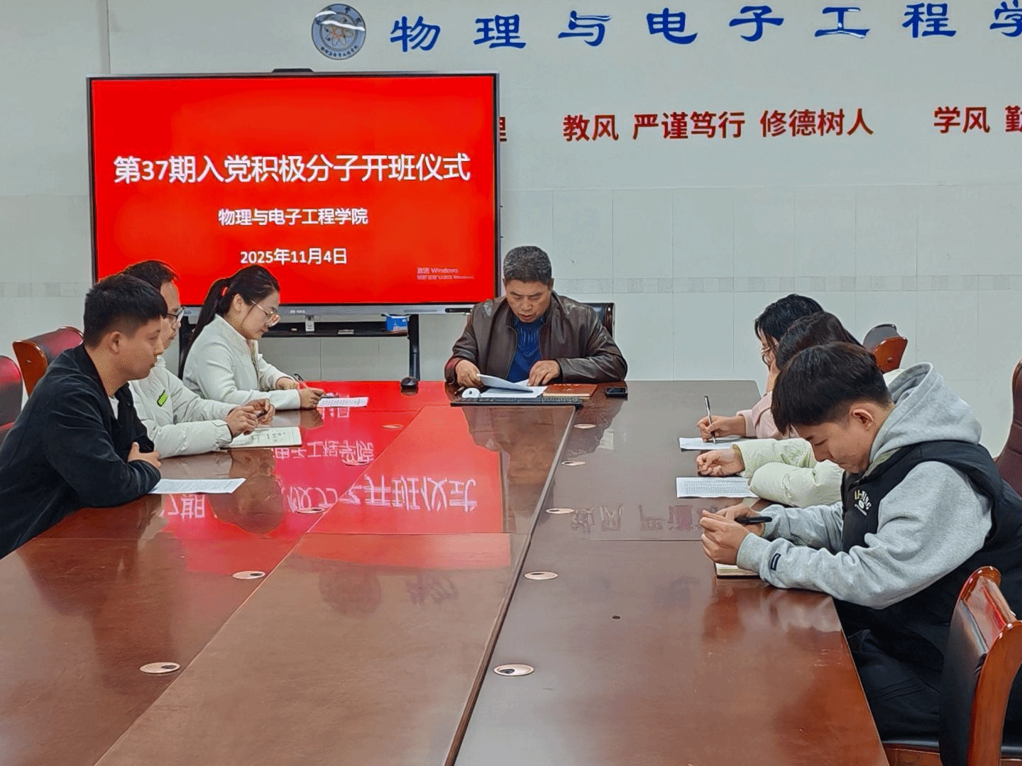 11月4日,物理与电子工程学院在综合实验楼W207会议室举办第37期入党积极分子培训班开班仪式。学院党委副书记祝清森、全体辅导员及第37期入党积极分子培训班学员参加本次开班仪式。
